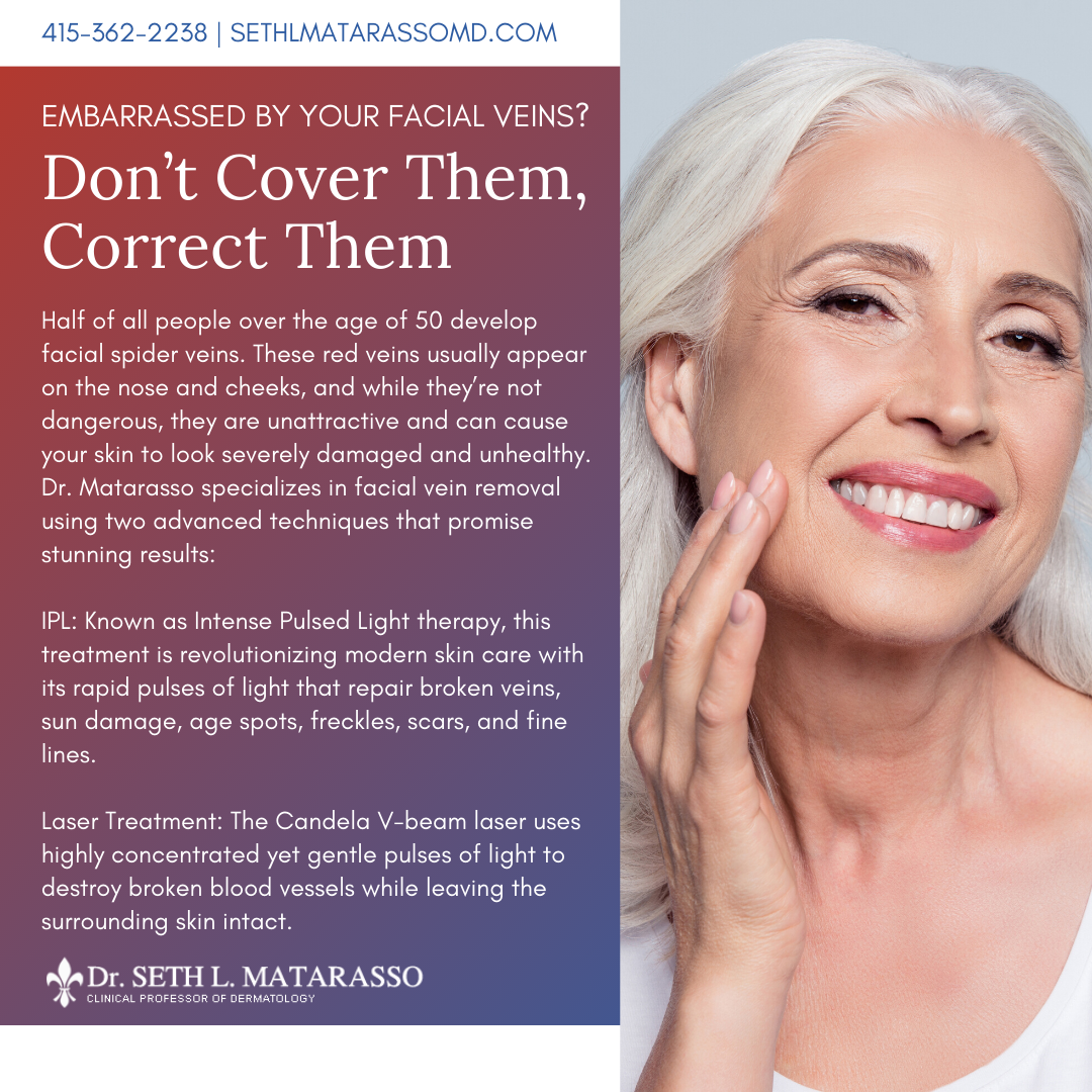 Facial vein removal is a non-surgical, non-invasive cosmetic procedure to clear the facial skin of unsightly spider veins. If you would like to learn more about facial vein removal in San Francisco, contact our office at (415) 362-2238. As a board-certified dermatologist, Dr. Seth Matarasso takes pride in his ability to provide cutting-edge, minimally invasive procedures to his patients.